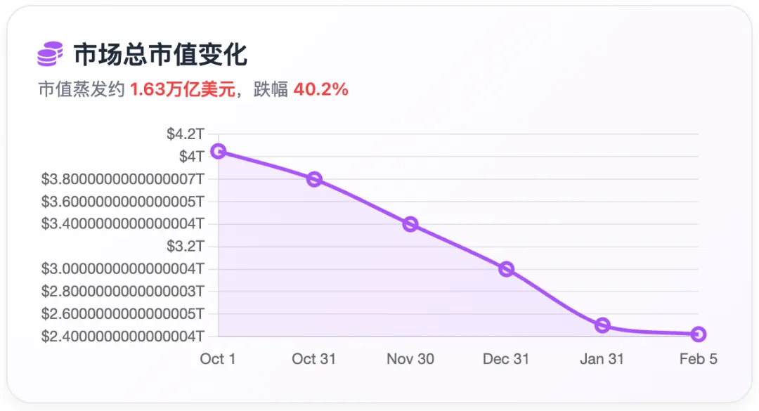 数据来源:CoinGecko、YCharts 等权威数据源时间范围:2025 年 10 月 1 日至 2026 年 2 月 5 日2025 年 10 月 6 日:比特币达到历史最高点 126,198 美元2025 年 10 月 8 日:以太坊达到年内高点约 3,840 美元2026 年 1 月 31 日:比特币跌破 8 万美元关键支撑位2026 年 2 月 1 日:比特币跌至 75,687 美元,以太坊跌至 2,202 美元2026 年 2 月 5 日:比特币最低触及 72,047 美元从图表可以清晰看出,比特币和以太坊在 2025 年 10 月创下各自高点后,均经历了持续的深度调整。比特币从 126,198 美元的历史高点跌至 72,047 美元,累计跌幅达 42.9%。以太坊的跌幅更为剧烈,从约 3,840 美元跌至 2,076 美元,累计跌幅约 46%。两条价格曲线在大部分时间内保持高度相关性,体现了主流加密货币的同涨同跌特征。特别是在 2026 年 1 月底的暴跌中,两者几乎同步跌破关键支撑位,形成了典型的恐慌性抛售行情。二、加密货币市场总市值变化图