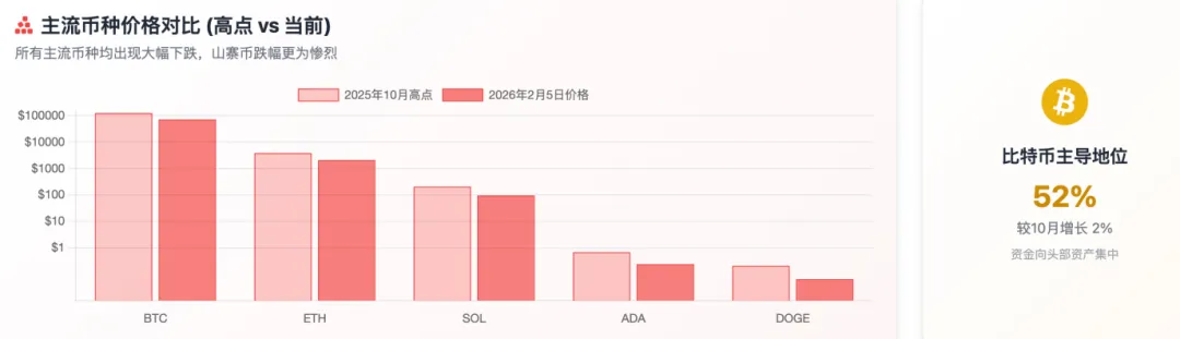 数据来源:CoinGecko、CoinMarketCap时间范围:2025 年 10 月 1 日至 2026 年 2 月 5 日2026 年 2 月 5 日:约 2.42 万亿美元加密货币市场总市值从 2025 年 10 月初的 4.05 万亿美元峰值,跌至 2026 年 2 月 5 日的 2.42 万亿美元,累计缩水约 1.63 万亿美元,跌幅达 40.2%。市值的下降呈现出加速趋势。第四季度单季市值就减少了 23.7%(约 9,460 亿美元)。进入 2026 年后,市场继续快速下跌,仅 1 月至 2 月 5 日就蒸发了约 5,800 亿美元市值。从市值占比来看,比特币的市场主导地位从 2025 年 10 月的约 50% 上升至 2026 年 2 月的 52% 以上,反映出在市场下跌过程中,资金向比特币 "抱团" 的避险特征。三、主流币种价格对比图