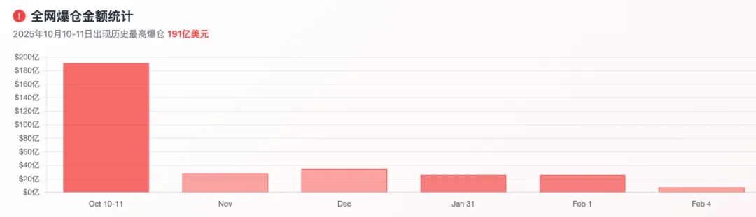 币种列表:比特币(BTC)、以太坊(ETH)、Solana(SOL)、Cardano(ADA)、狗狗币(DOGE)从图表可以看出,所有主流币种均出现大幅下跌,但跌幅存在明显差异。比特币作为市值最大的币种,跌幅为 42.9%,相对较为抗跌。以太坊跌幅约 46%,略大于比特币。山寨币的跌幅更为惨烈。根据参考数据,Solana 跌幅超过 50%,Cardano 跌幅约 64.7%,狗狗币跌幅高达 68.6%。这种 "山寨币跌幅大于比特币" 的特征,是加密货币市场熊市的典型表现。值得注意的是,尽管价格大幅下跌,比特币的相对强势地位得到了巩固,市场主导地位从 50% 上升至 52% 以上,体现了 "比特币效应" 在市场恐慌时期的作用。四、全网爆仓金额与次数统计