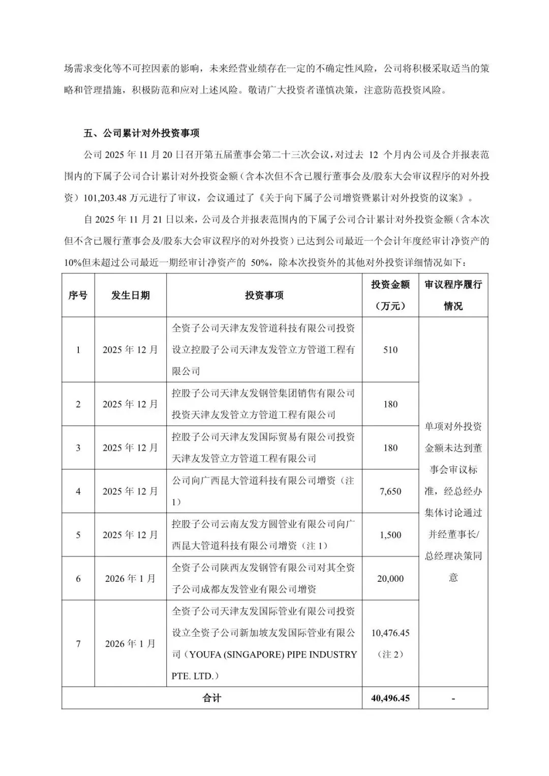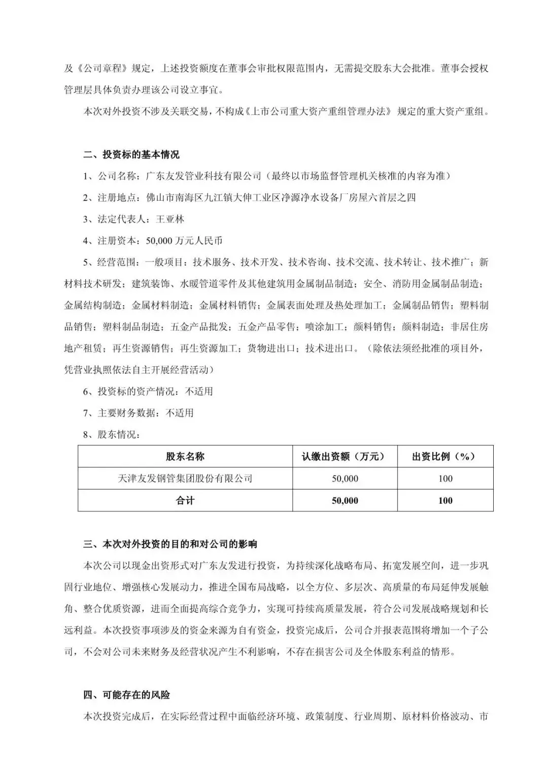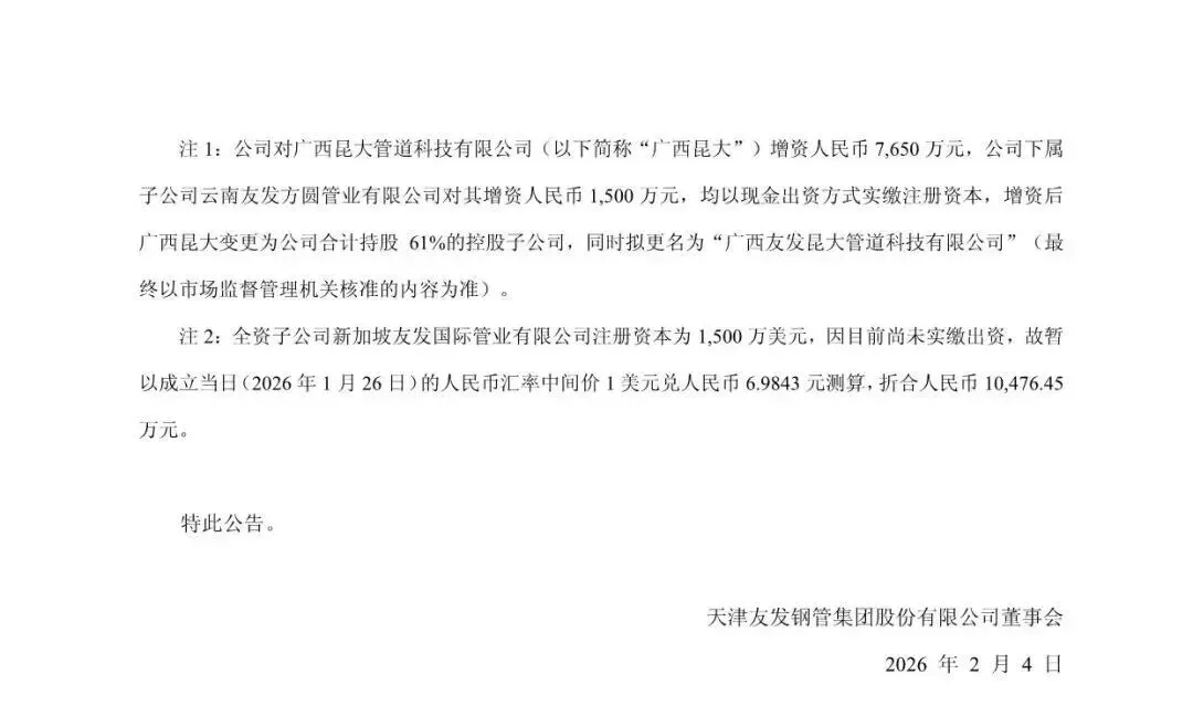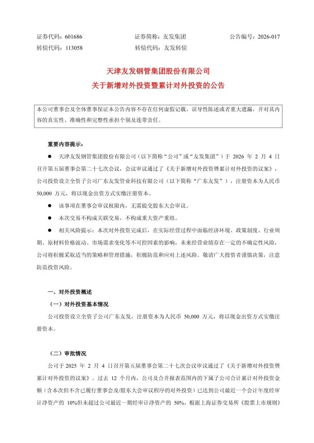 天津友发钢管集团股份有限公司发布公告称,于2026年2月4日召开第五届董事会第二十七次会议,会议审议通过了《关于新增对外投资暨累计对外投资的议案》,公司投资设立全资子公司广东友发管业科技有限公司,注册资本为人民币50,000万元,将以现金出资方式实缴注册资本。