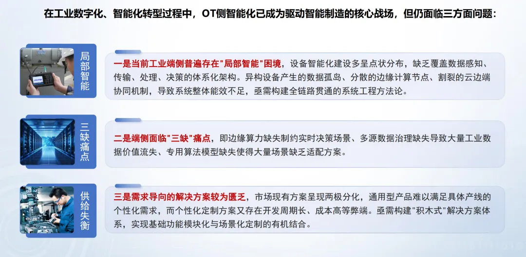 此外,工业端侧还存在显著的“三缺”痛点:边缘算力缺失制约实时决策、多源数据治理缺失导致价值流失、专用算法模型缺失使得方案难以适配具体场景。