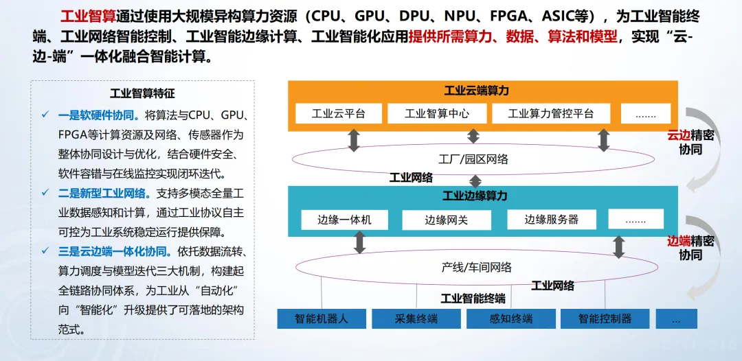 工业智算的出现, 恰好破解了这些痛点 。它通过大规模异构算力资源(如CPU、GPU、NPU等),构建起 “云 - 边 - 端” 一体化协同的架构,为工业生产打造了一套完整的 “骨架”:端侧负责实时数据感知,边缘侧实现毫秒级决策响应,云侧承担大规模模型训练与全局优化。以前需要上传云端分析的异常数据,现在在机器身旁就能瞬间完成判断,决策权的前移,让工业生产从 “机械执行” 真正迈向 “智能协作”。