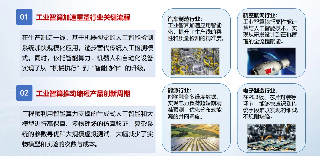 在行业应用层面,工业智算已在多个重点领域释放核心价值:汽车制造行业借助智能算力提升生产线柔性与质检精度;航空航天领域实现从研发设计到在轨管理的全流程赋能;能源行业通过多维度数据融合,实现电力负荷超短期精准预测,优化分布式能源的并网调度;电子制造行业能快速识别 PCB 板、芯片封装中的细微缺陷。