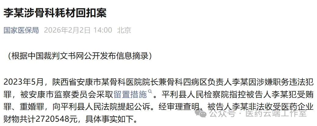 2023年5月,陕西省安康市某骨科医院院长兼骨科四病区负责人李某因涉嫌职务违法犯罪,被安康市监察委员会采取留置措施。