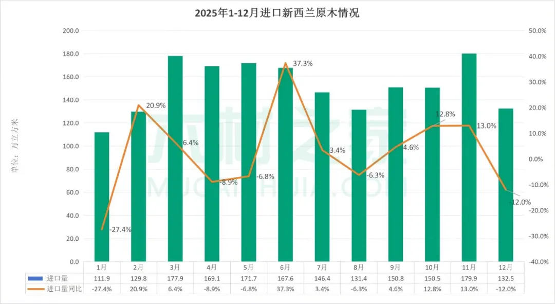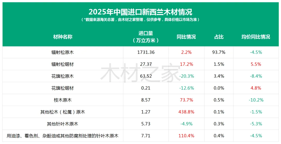 海关数据显示,2025年中国自新西兰进口的木材(包含原木和锯材)累计达1847.2万立方米,同比增长1.85%。从结构来看,原木占绝对主导地位,进口量达1819.6万立方米,占比98.5%,相当于中国原木进口总量的58%,同比增幅1.66%;对应进口额为21.36亿美元,同比下降3.1%。