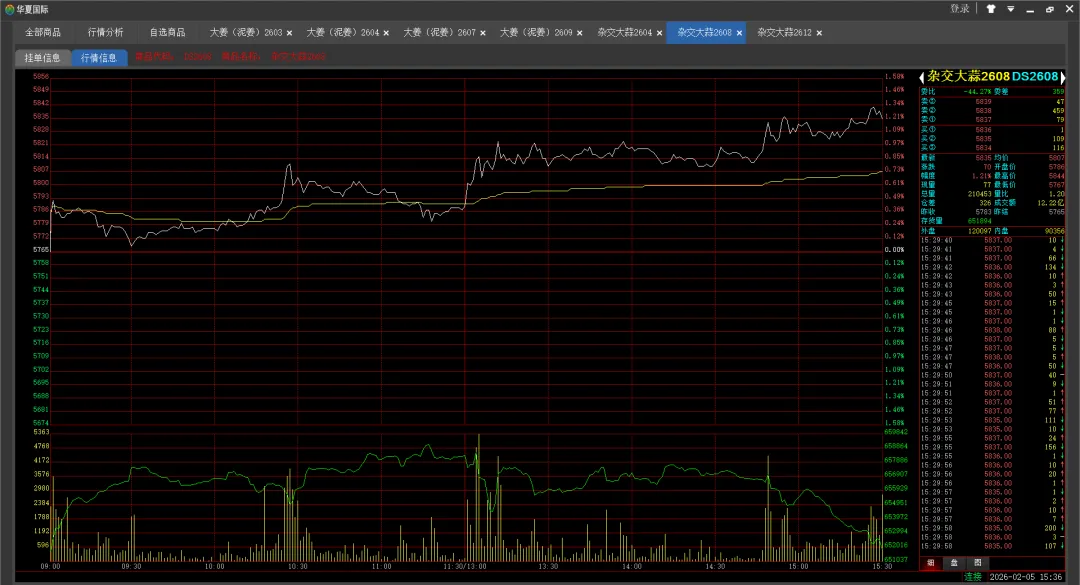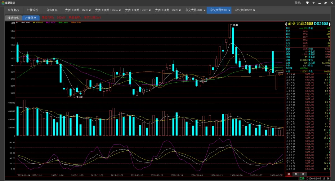 今日早上现货总体行情平稳,早盘大蒜2608合约平开在5786价格,随即冲击5800未能成功,空方增仓压制,迫使价格震荡下行至日内低点5767价格,因多单筹码未出现动摇,空单短线筹码获利减持,盘面震荡回升,并一路突破5800价格压制,来到5810附近。之后空单筹码回补,盘面震荡下行,回落5780价格,尾盘有所止跌,中午收盘在5789价格。