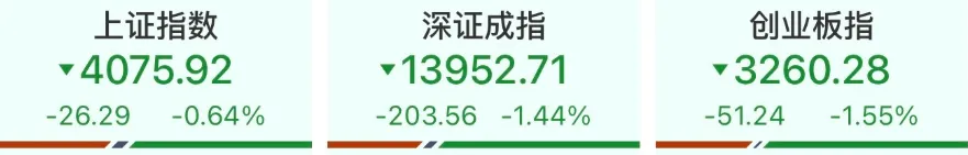 截至收盘,沪指跌0.64%,深成指跌1.44%,创业板指跌1.55%。