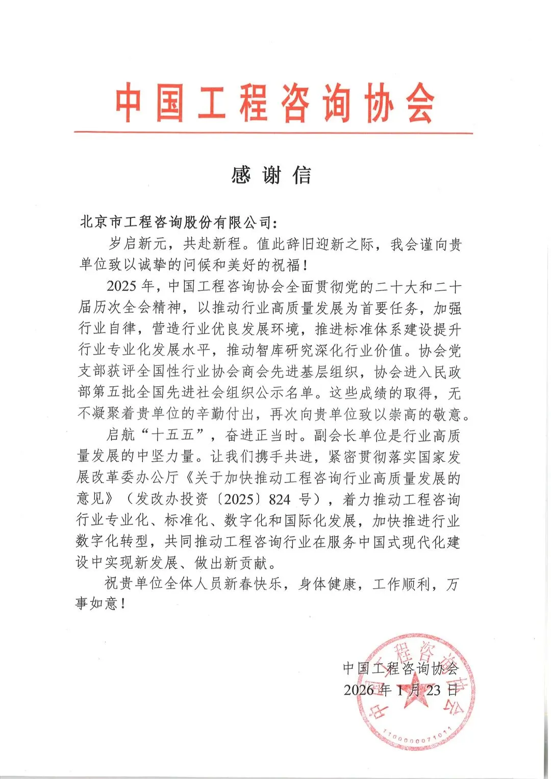 感谢信印证了北咨公司2025年在工程咨询领域深耕细作、助力行业高质量发展的实际成效,既是对公司作为中咨协会副会长单位履职担当的高度肯定,更是对公司坚守专业初心、践行国企责任的激励与期许。