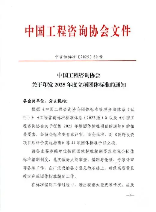 在深耕智库研究的同时,北咨公司始终以推动行业规范发展为己任,主动投身行业标准化建设工作,以健全标准体系引领行业提质升级。2025年,公司深度配合中咨协会团体标准体系建设,组织专业团队对《工程咨询服务质量评价实施指南》系列团体标准中的两项标准开展多轮论证,提出建设性意见。同时,公司成功申请立项主编《战略性新兴产业及未来产业项目评估咨询标准》,引领未来产业项目咨询工作高质量开展;立项参编《地方发展规划编制规范》,以专业实力筑牢行业发展根基。