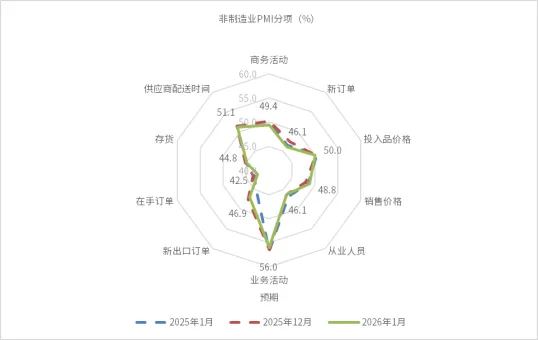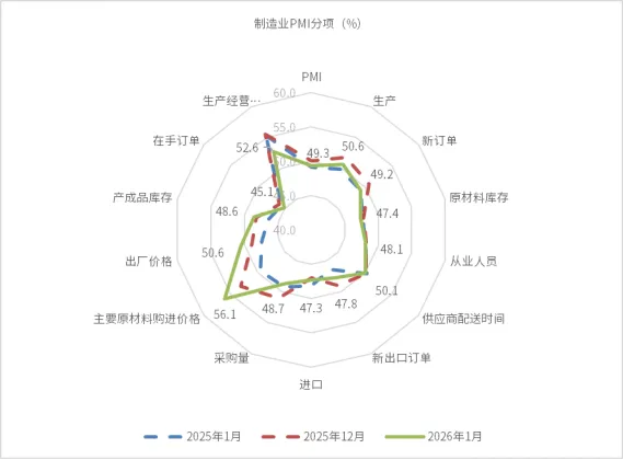 1月制造业价格相关指标出现较为明显的回升。主要原材料购进价格指数升至56.1%,较上月提高3.0个百分点;出厂价格指数回升至50.6%,时隔较长时间重新站上荣枯线,显示制造业价格水平整体有所改善。