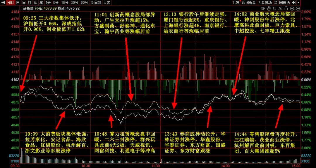 市场全天缩量调整,三大指数集体下挫。大消费板块逆势走强,食品饮料、零售、影视院线、旅游酒店方向轮番活跃,横店影视、茂业商业、三江购物、三峡旅游、海欣食品等多股涨停。银行、券商股午后拉升,厦门银行、华林证券涨停。下跌方面,贵金属板块下挫,湖南白银跌停;太空光伏概念调整,钧达股份等跌停。个股跌多涨少,沪深京三市约3700股飘绿,今日成交2.19万亿。截止收盘沪指跌0.64%,深成指跌1.44%,创业板指跌1.55%。两市共1588只个股上涨,56只个股涨停,3462只个股下跌,23只个股跌停,10只股票炸板,炸板率18%。