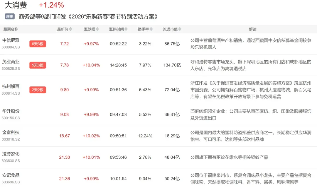大消费板块今日迎来爆发,早盘中信尼雅、杭州解百、拉芳家化等快速上板,尾盘茂业商业、三江购物也跟随封板。