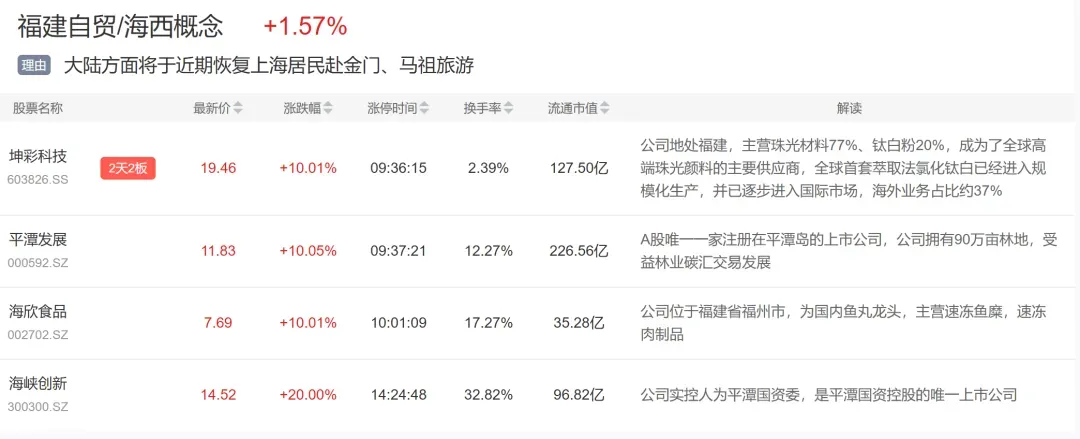 福建自贸区今日突然走强,平潭发展、海欣食品双双涨停,海峡创新20cm上板。