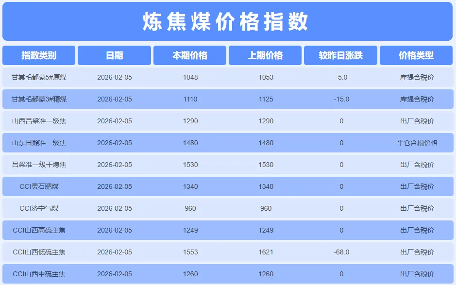 2026年2月5日,焦煤焦炭市场呈现 “优质煤种显著回调,整体格局弱势运行” 的特征。数据显示,山西低硫主焦煤出厂含税价大幅下跌68元/吨至1553元/吨,进口蒙煤价格亦同步走弱,甘其毛都蒙5#原煤和蒙3#精煤分别下跌5元/吨和15元/吨。而中硫、高硫主焦煤及配煤价格持稳,焦炭各环节价格也全面持平。