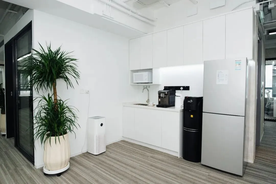 功能分区清晰,涵盖办公区、洽谈区、休闲区、会议区,会议室、水吧、打印机等设施齐全。