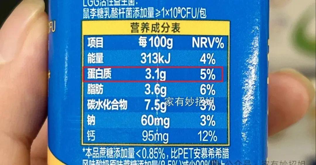 这个有国家标准的 , 发酵乳每100g蛋白质不能低于2.9g , 风味发酵乳不能低于2.3g , 低于这个数 , 要么奶少水多 , 要么压根就不是正经酸奶 , 营养价值大打折扣。