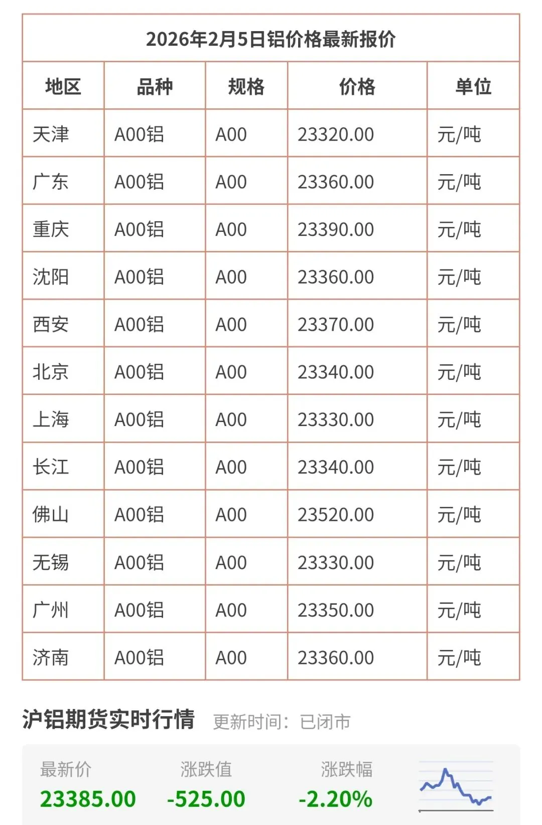 今天2月5日更新,今日铝价行情查询,包括天津、广州、上海、北京、无锡、广东、佛山等地区铝现货价格!长江有色铝锭最新价格是多少钱一公斤一览表