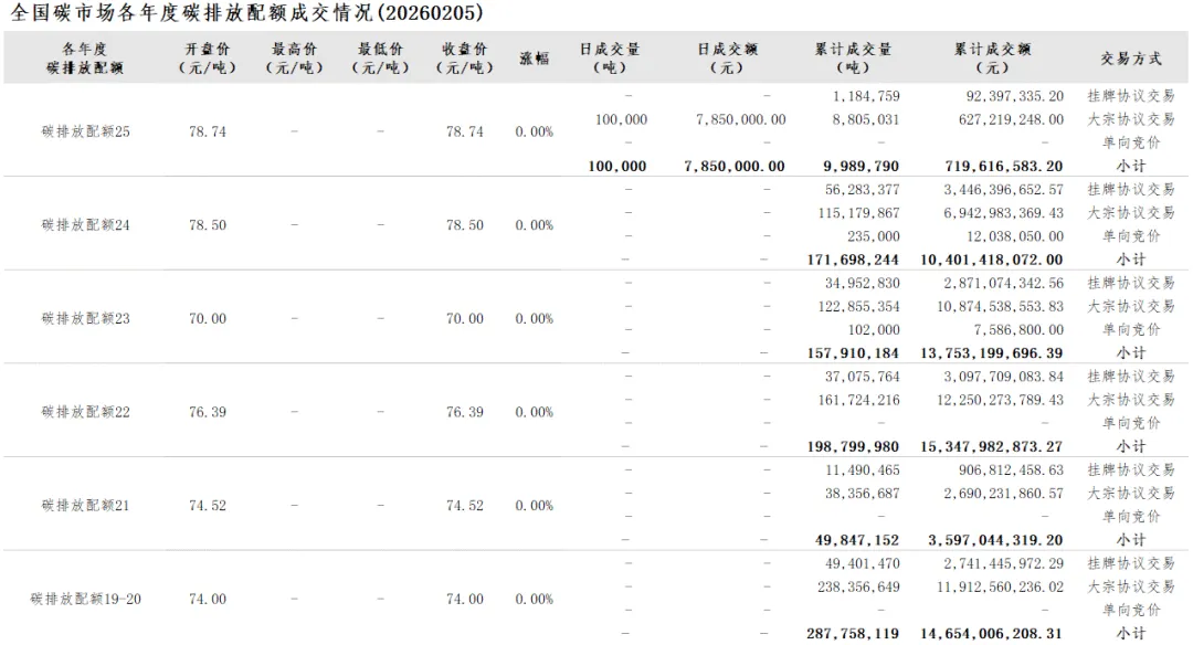 【20260205】全国碳市场每日价格行情及成交信息
