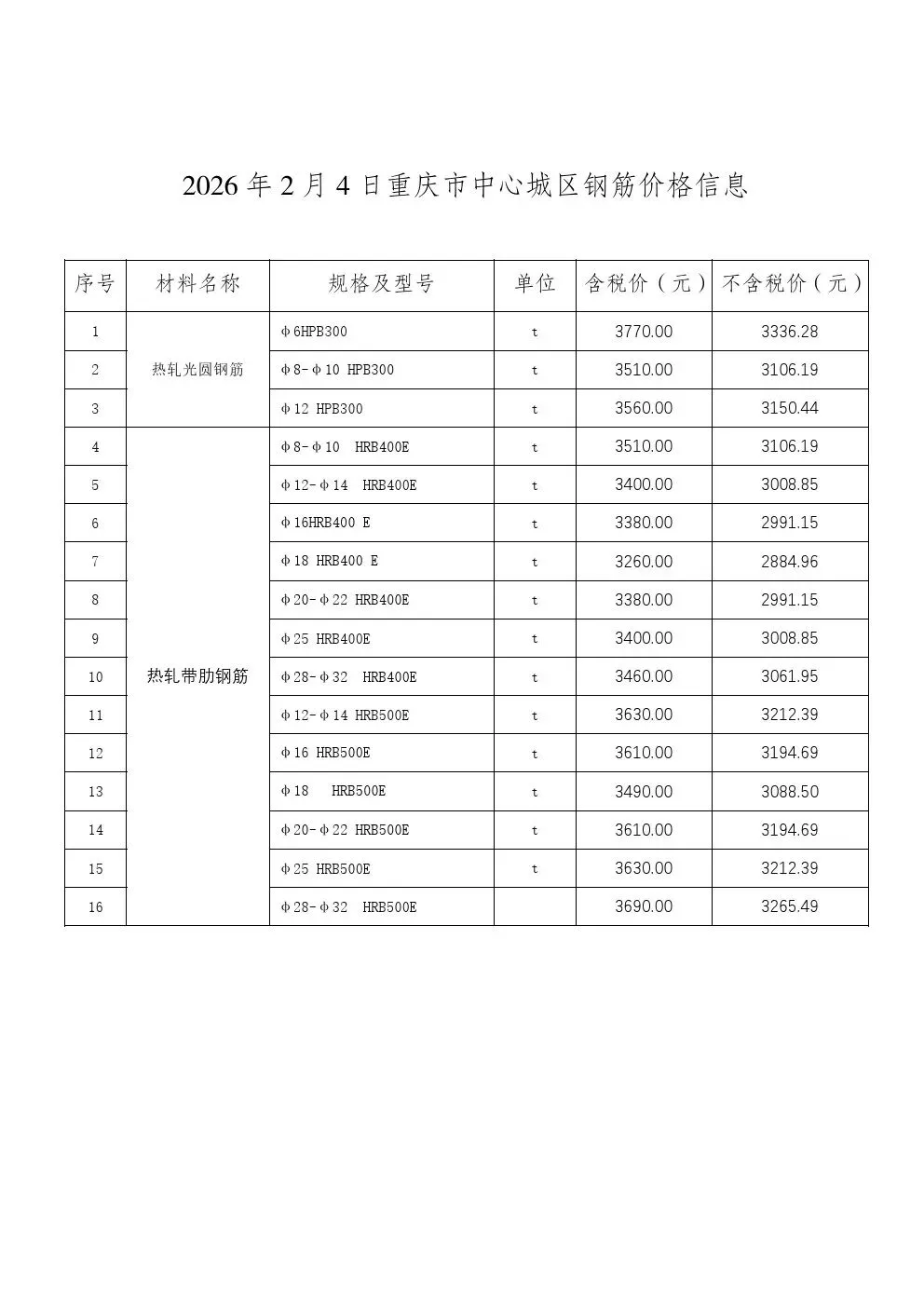 >2026年2月4日重庆市中心城区钢筋价格信息