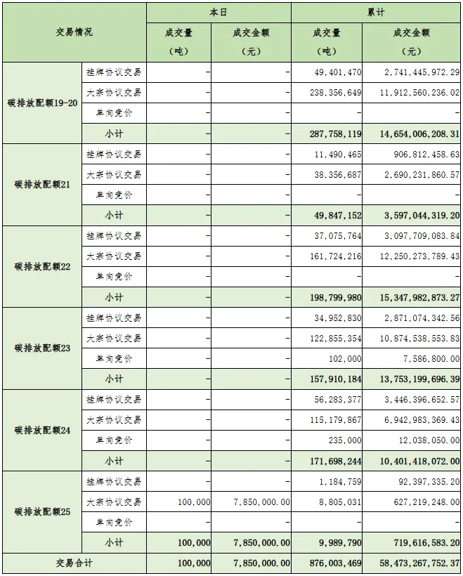 今日全国碳排放权交易市场成交总量100,000吨,成交总额7,850,000.元,成交均价78.5元/吨。截至今日,全国碳排放权交易市场累计成交总量876,003,469吨,累计成交总额58,473,267,752.37元。