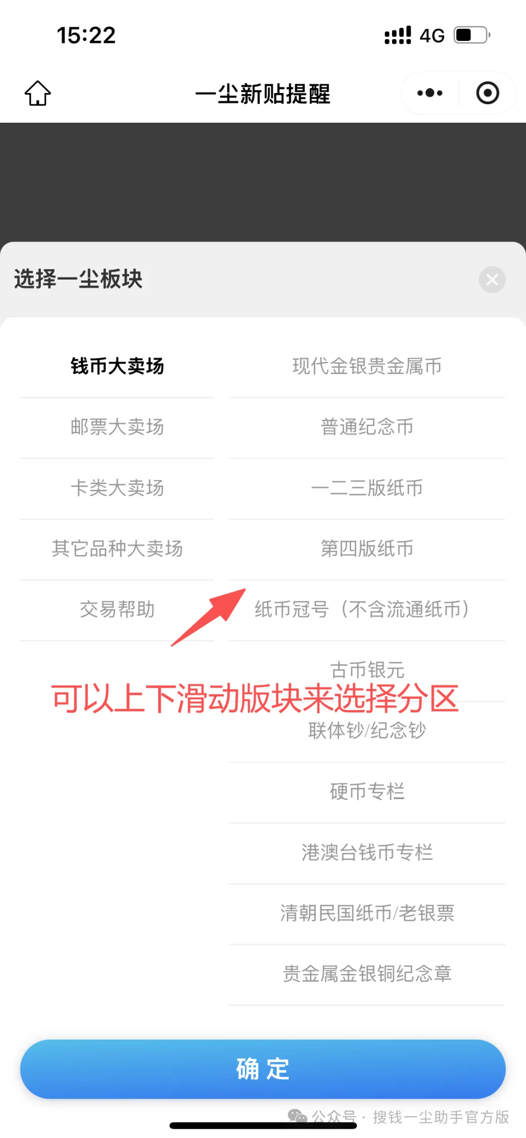 第一步,选择一尘板块,可以上下滑动版块来选择分区,一定要根据藏品类型准确选择版块。