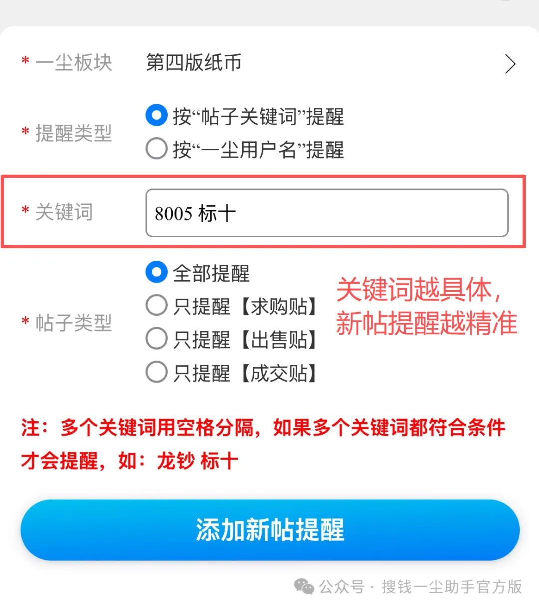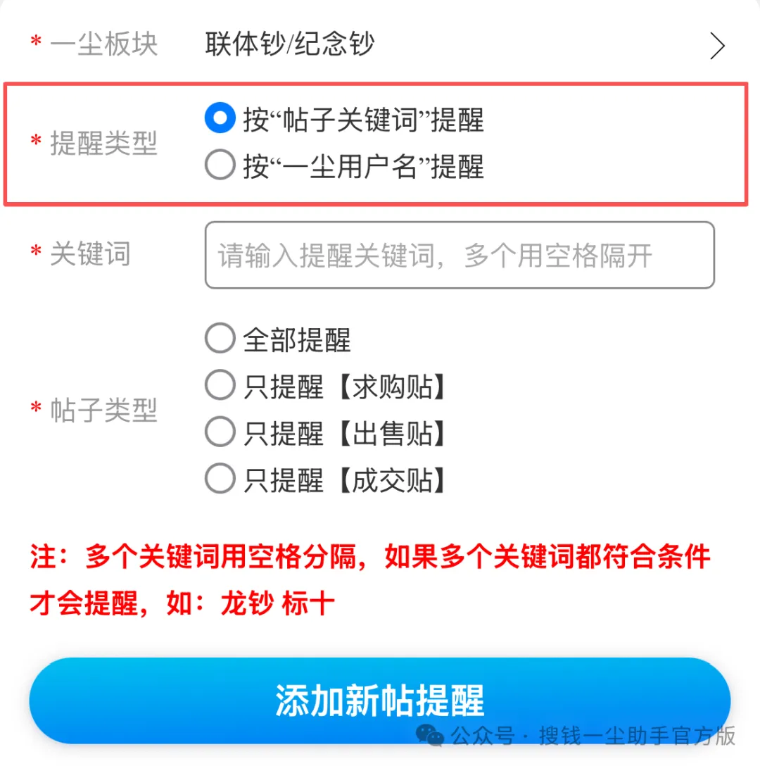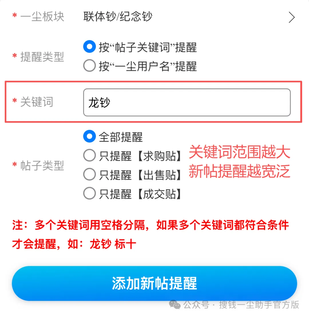 选择「按“帖子关键词”提醒」:一尘网上其他用户发布的新帖,帖子的标题/内容里包含了设置的这个关键词,搜钱一尘助手会实时监测这个关键词,一旦有用户发帖,您就会在搜钱一尘助手和搜钱服务号上收到新消息提醒。