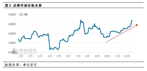 皮棉价格从10月初的阶段性低点逐步回升,主要受多重因素共同驱动,一方面是今年新棉上市初期,贸易商预购积极性较高,伴随皮棉销售推进,12月份售卖压力明显减轻,部分中间商甚至难以寻得合适货源;另一方面,上年度结转库存偏低,下游市场集中采买,四季度市场消费达到年内高峰期,提振市场看涨信心;再者,市场预期下年度棉花种植面积或调将,后续供应或减少,推升业者看涨预期。卓创资讯监测数据显示,12月底皮棉价格上涨至15077元/吨,较9月底上涨883元/吨。