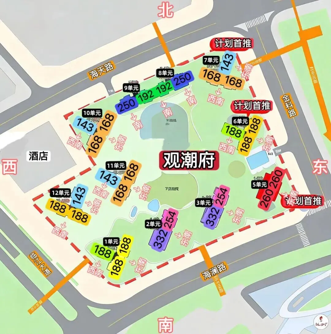 面积有143㎡的4房2卫,168-190-193㎡的4房3卫,253-254-260㎡的4房4卫,332㎡的4房5卫户型,共629套房源,纯南向户型,带高品质精装交付!观潮府的项目规划正式出炉,最低楼层22层,最高24层,规划容积率仅3.4。