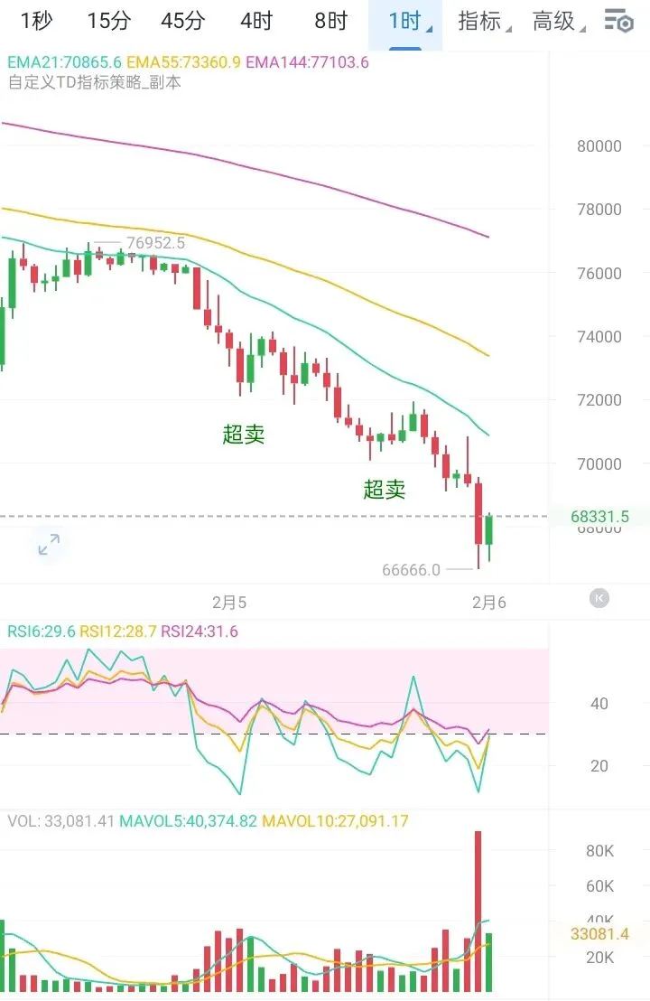 昨夜市场在深度回调后展现强劲韧性,大饼精准测试66666美元支撑后快速反弹近2000点,显示该区域存在大量买盘承接。技术面四小时级别出现明确底背离信号,且价格重新站上布林带中轨,表明短期下跌动能已充分释放,为新一轮上攻奠定了基础。
