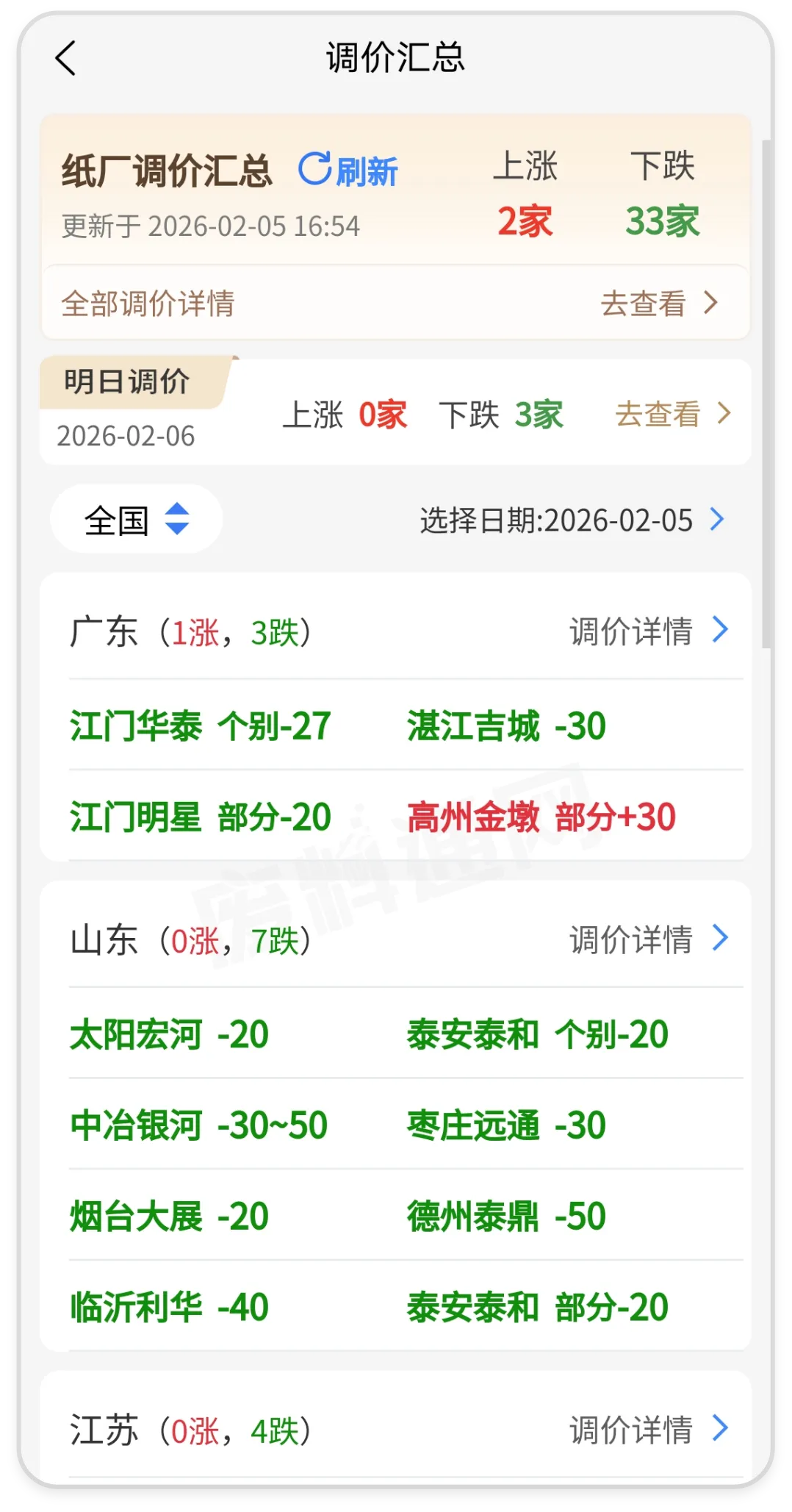 2月6日起,四川【华侨凤凰】纸业黄板纸大类下调10元/吨。运费补贴20元和厂车运费优惠政策继续执行到2月10日。另鉴于春节将至,包场收货量增加,我司将会大幅度提升卸货效率,减少排队时间,为各位做好配套工作。卸货时间为:7:00-23:00。价格详情具体如下:A级1525,