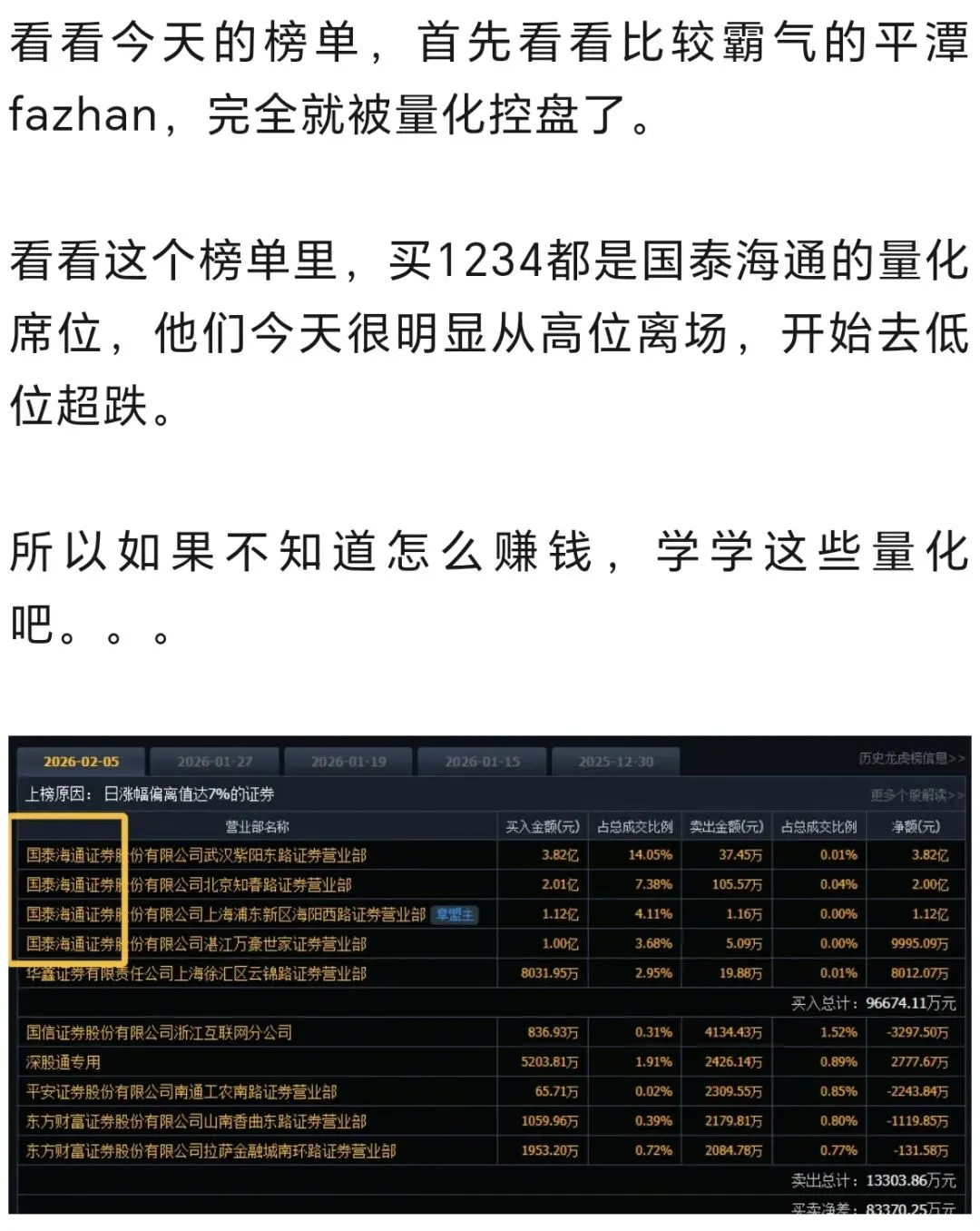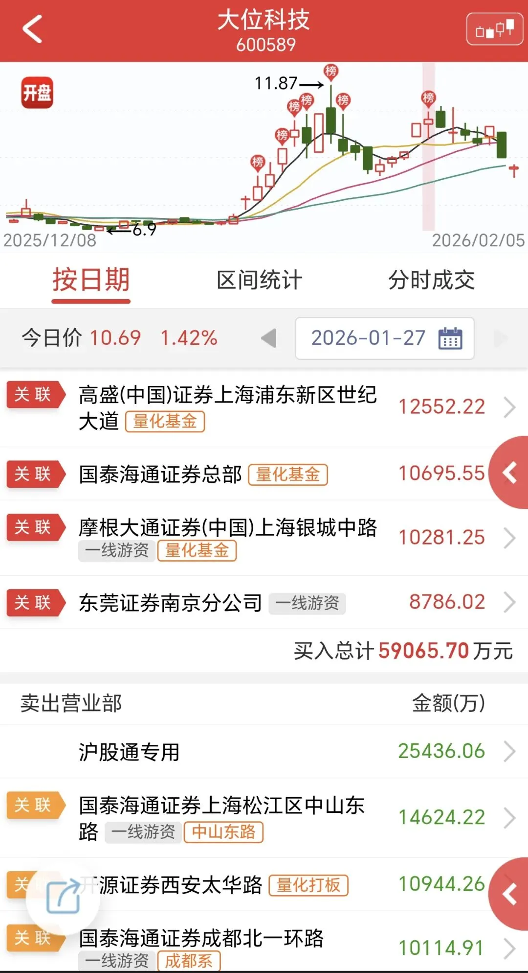 事实上量化基金也有很多时候给游资接盘的时候。比如下图2026年1月27日的大位科技龙虎榜: