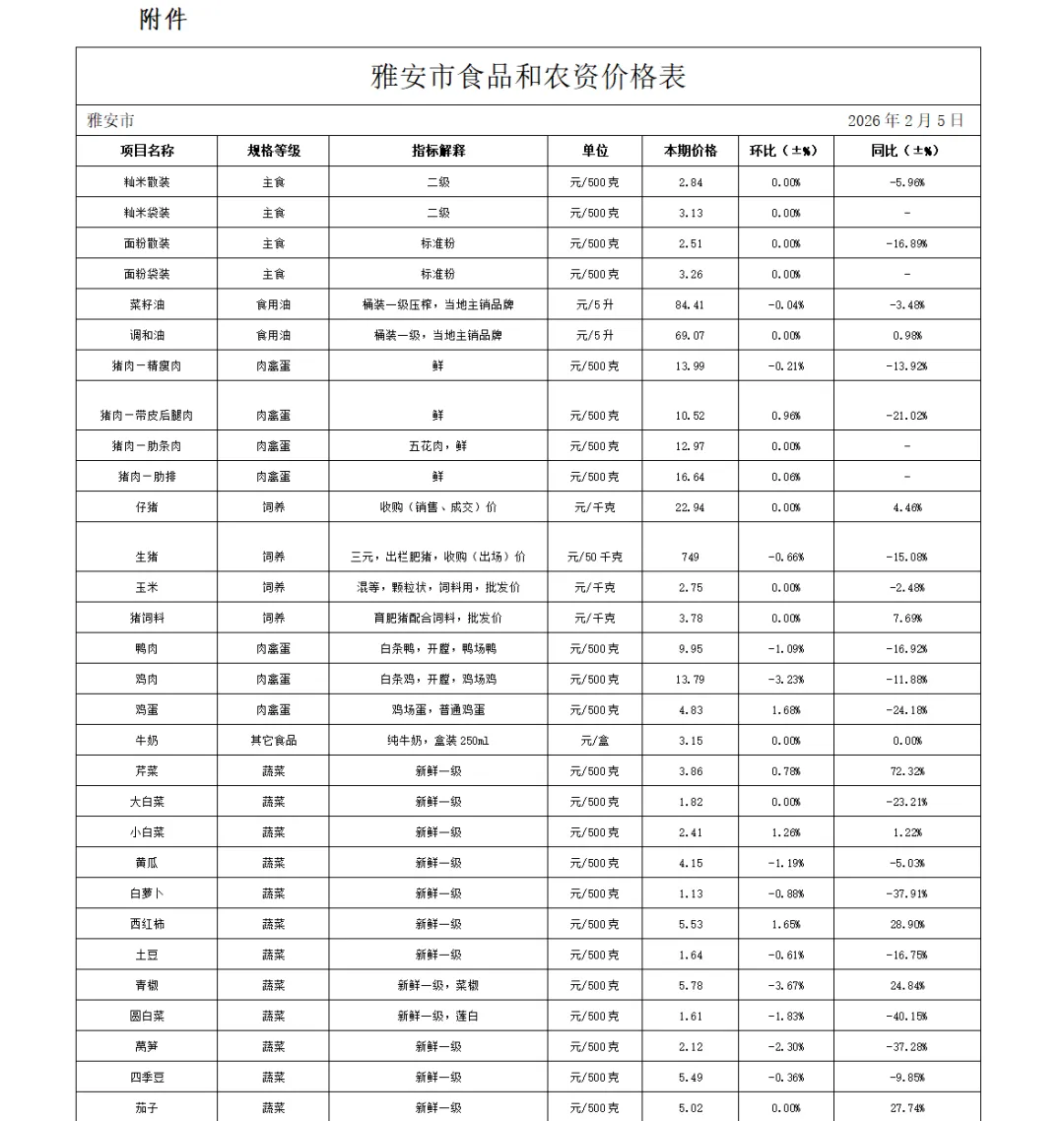 (一)价格方面。一是猪肉零售均价有涨有跌。带皮后腿肉、肋排零售均价分别为10.52元/500克、16.64元/500克,均较上期上涨0.96%、0.06%;肋条肉零售均价12.97元/500克,与上期持平;精瘦肉零售均价13.99元/500克,较上期下降0.21%。二是生猪价格略降。监测的生猪收购均价749元/50千克,较上期下降0.66%。三是仔猪价格平稳。仔猪收购均价22.94元/千克,与上期持平。四是饲料类价格平稳。育肥猪饲料、玉米市场均价分别为3.78元/500克、2.75元/千克,均与上期持平。