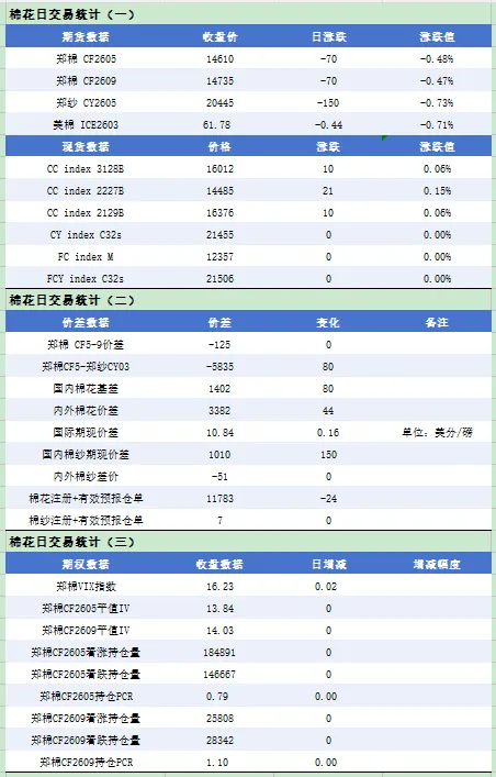 - 双卖策略:在当前郑棉价VIX指数15.57%条件下,可考虑卖CF2605-C-15000+卖CF2605-P-14000的双卖策略,赚取期权金。
