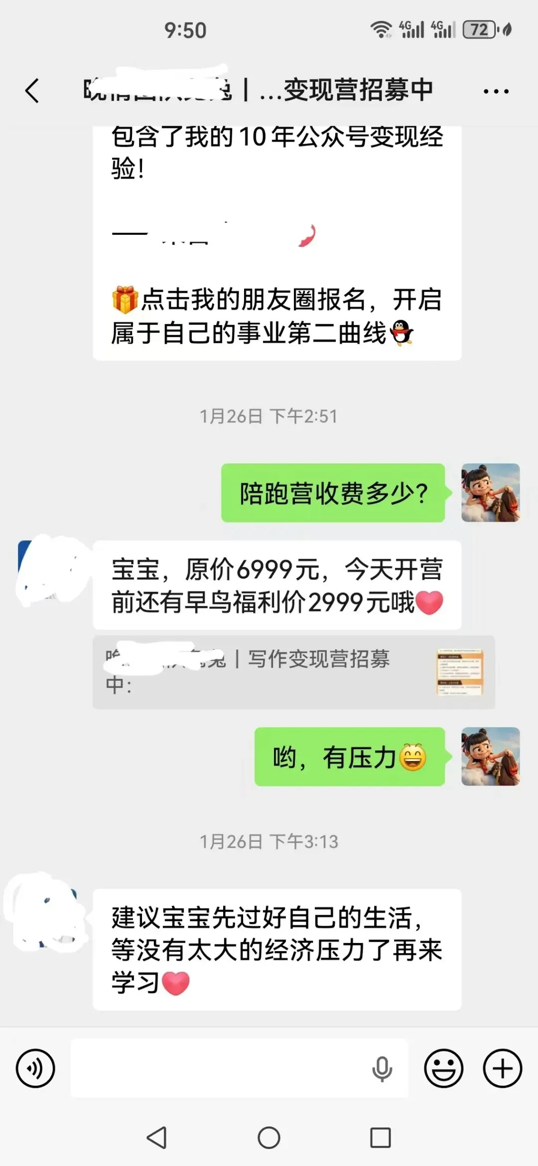 她预想中的回复是:"宝宝,投入产出成正比,咱们性价比很高的,现在报名还有优惠哦~"