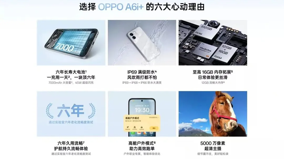 OPPO A6i+搭载联发科天玑6300处理器,标配LPDDR4x和UFS2.2,顶配版为12GB+512GB,亮点是支持存储卡(2TB)扩容功能。天玑6300属于入门款5G芯片,采用6nm工艺制程且拥有2.4GHz高能大核,不建议游戏和性能用户选购。机身内置7000毫安时电池,支持45W有线充电,官方宣称该电池拥有6年超长寿命。
