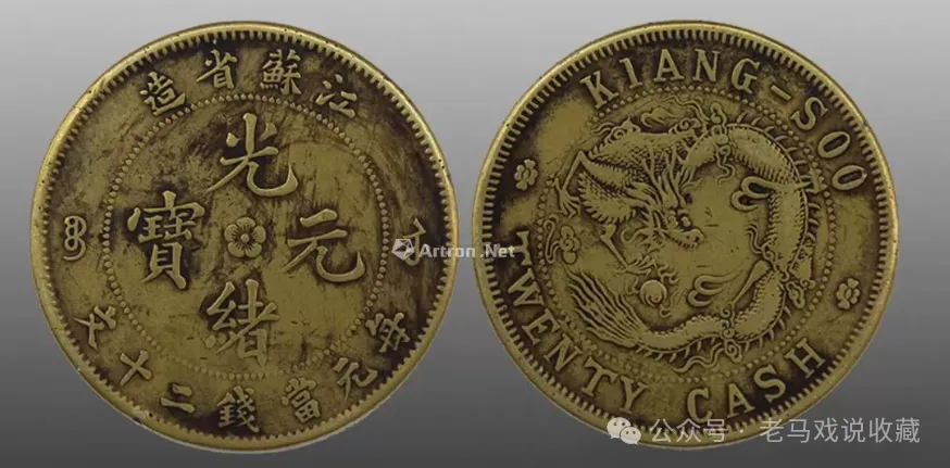 藏品描述:江苏省造光绪元宝每元当钱二十文黄铜版,直径3.2cm,重10.17g,该币以黄铜为材质,色泽温润,质感沉稳,历经岁月洗礼,更显古朴韵味。其正面设计精美,中心镌刻“光绪元宝”四字,五瓣花为中心,花瓣线条流畅,形态优美,寓意着繁荣与昌盛。上方环绕“江苏省造”四字,下方刻有“每元当钱二十文”字样,清晰标注了货币的面值。背面图案更为独特,一条小飞龙腾空而起,龙身矫健,龙爪锋利,展现出一种威严与力量。钱币外观周正,线条流畅,体现精湛铸造技艺。岁月沉淀使铜币呈现熟旧深沉、包浆自然之貌,犹如述说历史沧桑。钱文深峻,每个字皆端庄大方,遒劲有力,散发古朴典雅气息。作为钱币核心元素之一的边齿,该币亦表现出色,标准圈齿凸起,颗粒清晰,展示极高工艺水准。