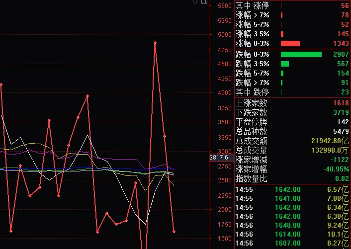 日内成交量,继续萎缩,相较于昨日且更是大幅缩减至2.2万亿水平,缩量大跌,不是好的盘面表现,各类方向的预期都在向坏的预期发展,所以按前期所说,空仓的继续空仓休息,持仓的只要是超跌方向也别急着低位割肉,这是行情的一贯套路,举个例子,一只股从10元涨到20元,从15开始买,逐步加仓,现在持仓13元,个股则跌到了11.5附近,套了10%+,现在割肉就大概率不划算,可能该股还会跌至11甚至跌回10附近,但一旦反弹,就会很快速,如果你11附近割肉出了,大概率后续反弹的时候,很难再以11左右的价格买回来,可能需要12甚至更高的价格才能买回来,老股民都该懂我说的。