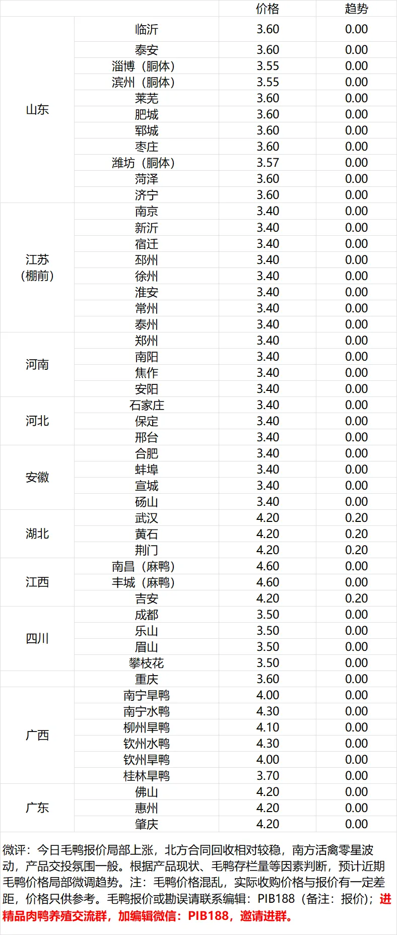 微评:鸭苗报价上涨。(注:南方只报当天价格)交投计划平稳,供需平衡。根据产品、养殖成本及鸭苗现状分析,预计近期鸭苗价格呈稳中微调趋势。种蛋报价涨5分。温馨提示:该价格为主流厂家报价,实际销售价格以成交价格为准,价格仅供参考。