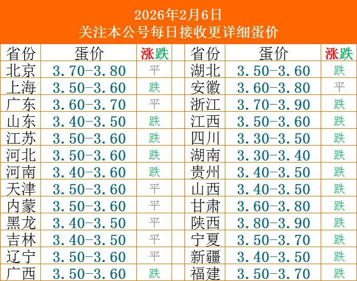 今日蛋价多地企稳、部分省份继续下落,北京、东北三省以稳为主,鸡蛋价格维持在3.40-3.70元/斤,以质定价,实际成交灵活,走货正常。