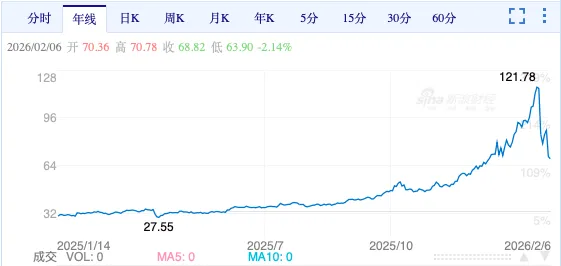 到了2月份,空头对多头的屠杀进一步加剧,6号早上,白银价格最低跌到了63.9,相比121.78的最高点,已经跌去了47.53%。