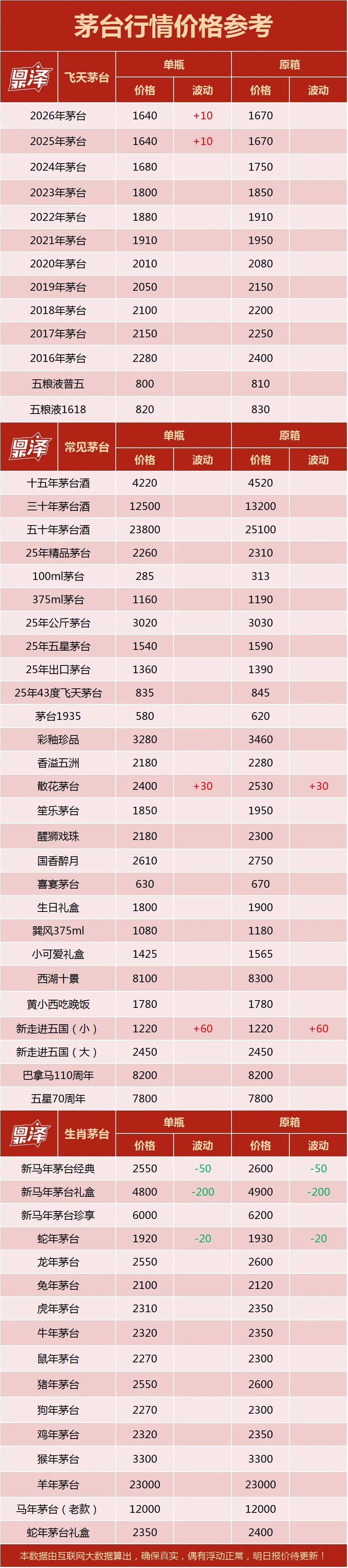 【茅台每天行情价格表】