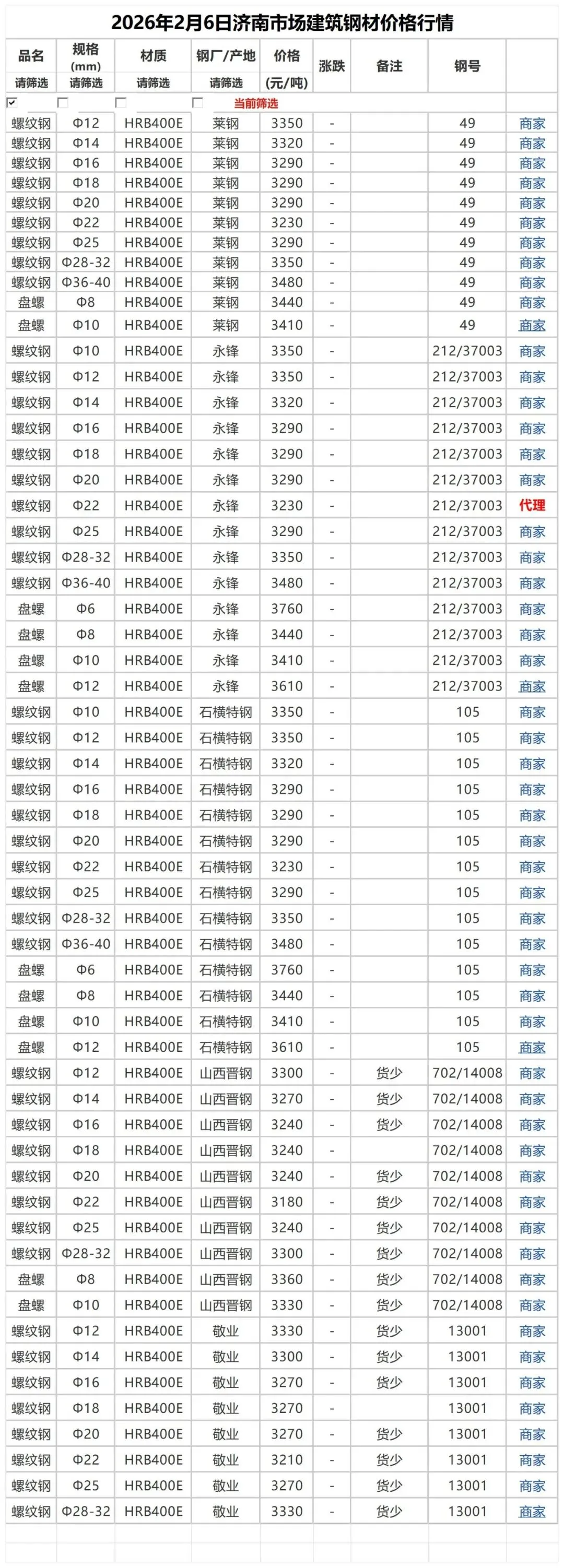 >2月6日市场建筑钢材价格行情