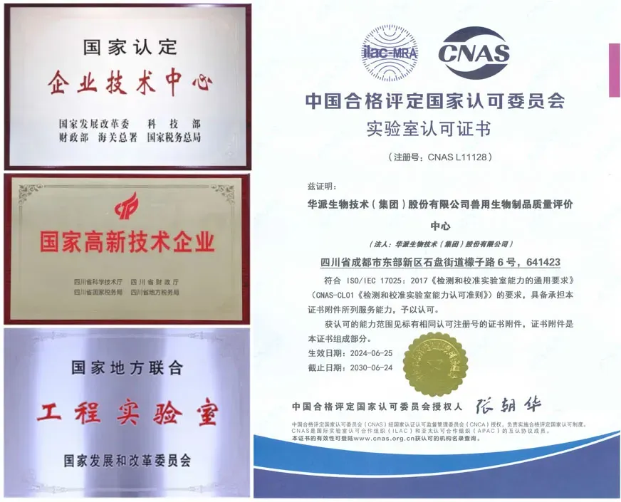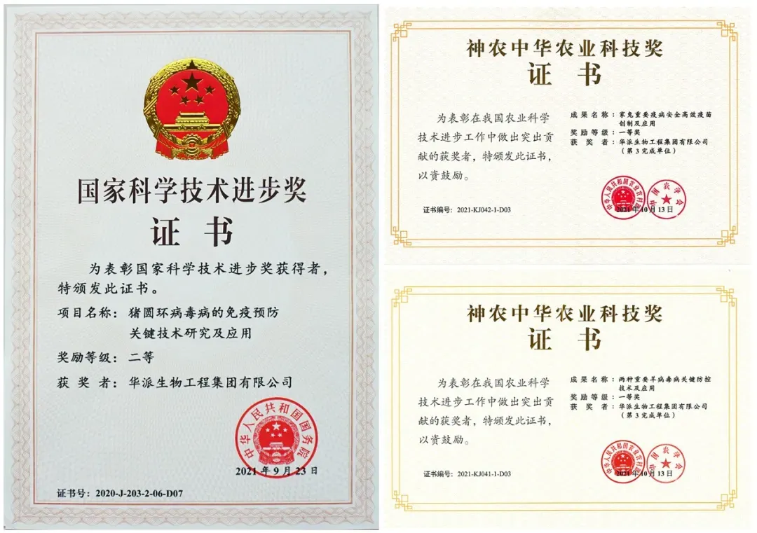 华派生物技术(集团)股份有限公司是一家专业从事动物疫苗、兽用抗体、保健兽药和诊断试剂研发、生产、销售、技术服务、技术成果转让的现代化动保企。集团旗下拥有5个兽用生物制品生产基地和1个保健兽药生产基地。集团总部位于成都天府国际机场航空港——成都东部新区石盘街道檬子路6号,总投资超15亿元。公司先后获得了“国家企业技术中心”、“国家高新技术企业”认定,拥有“兽用核酸及亚单位疫苗制备技术国家地方联合工程实验室”和国家CNAS认证检测诊断室。目前,已获国家科技进步二等奖1项,农业农村部神农中华农业科技一等奖2项,新兽药证书32个,国家发明专利28项,实用新型专利74项。拥有兽用生物制品批文51个,在研产品40余个。