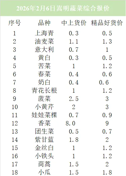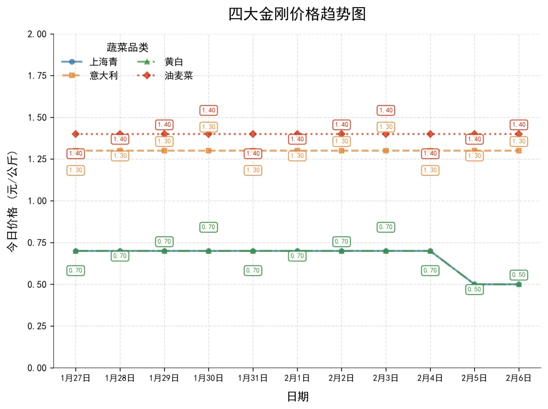 2月6日,意大利今日价格1.3元/公斤;油麦菜今日价格1.4元/公斤;上海青今日价格0.7元/公斤。黄白今日价格0.5元/公斤。