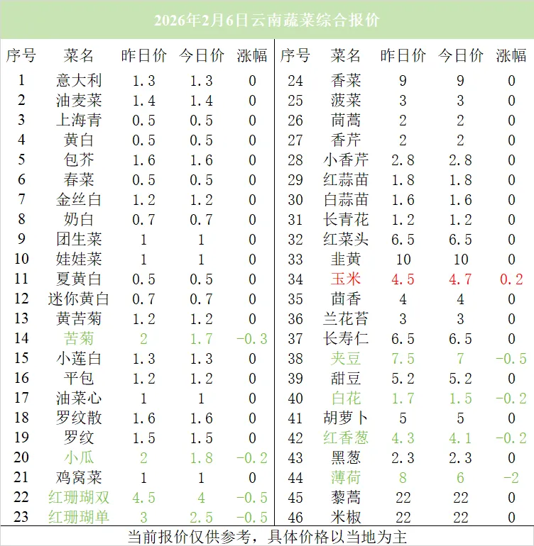 2月6日,香菜今日价格9元/公斤;菠菜今日价格3元/公斤;苦菊下降0.3元,今日价格1.7元/公斤。鸡窝菜今日价格1元/公斤;茴香今日价格4元/公斤。