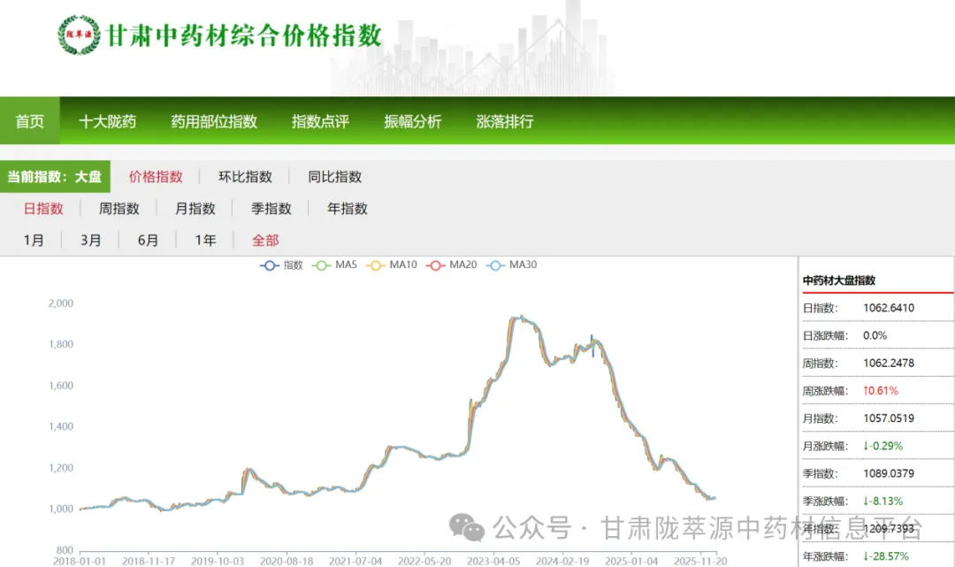 据对甘肃中药材(39个品种)价格监测显示,2026年1月份甘肃中药材价格大盘指数为1057.05点(以2018年1月份平均价格为基期),与上期1060.08点(2025年11月)相比,下滑3.03点,跌幅0.28%。