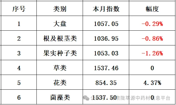 (1)根及根茎类:上月指数收于1045.996点,本月指数1036.948点,下跌9.048点,跌幅0.86%。