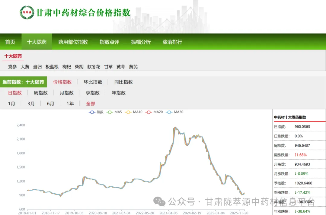 甘肃十大陇药(当归、黄芪、党参、大黄、板蓝根、枸杞、柴胡、款冬花、甘草、黄芩)价格监测显示,2026年1月份甘肃十大陇药价格指数为934.46点(以2018年1月份平均价格为基期),与上期935.35点(2025年12月)相比,下滑0.89点,跌幅0.09%。