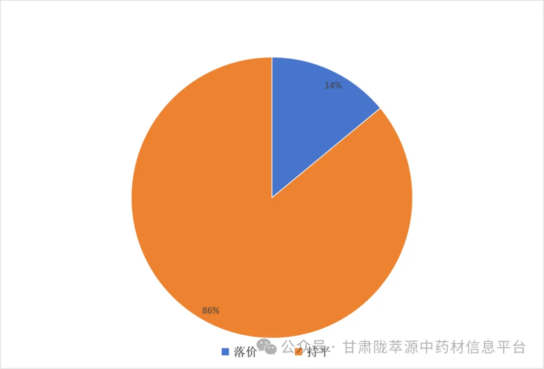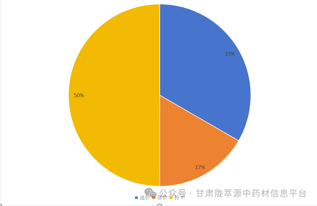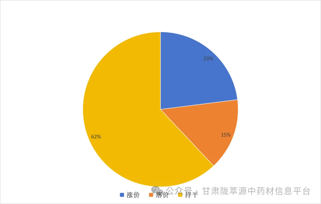 根及根茎类24个品规中(丹参、党参、升麻、大黄、天麻、当归、旱半夏、板蓝根、柴胡、桔梗、独活、甘草、百合、秦艽、红芪、纹党参、羌活、肉苁蓉、赤芍、银柴胡、锁阳、防风、黄芩、黄芪),涨价品规占33%;落价品规占17%;价格持平的品规占50%。