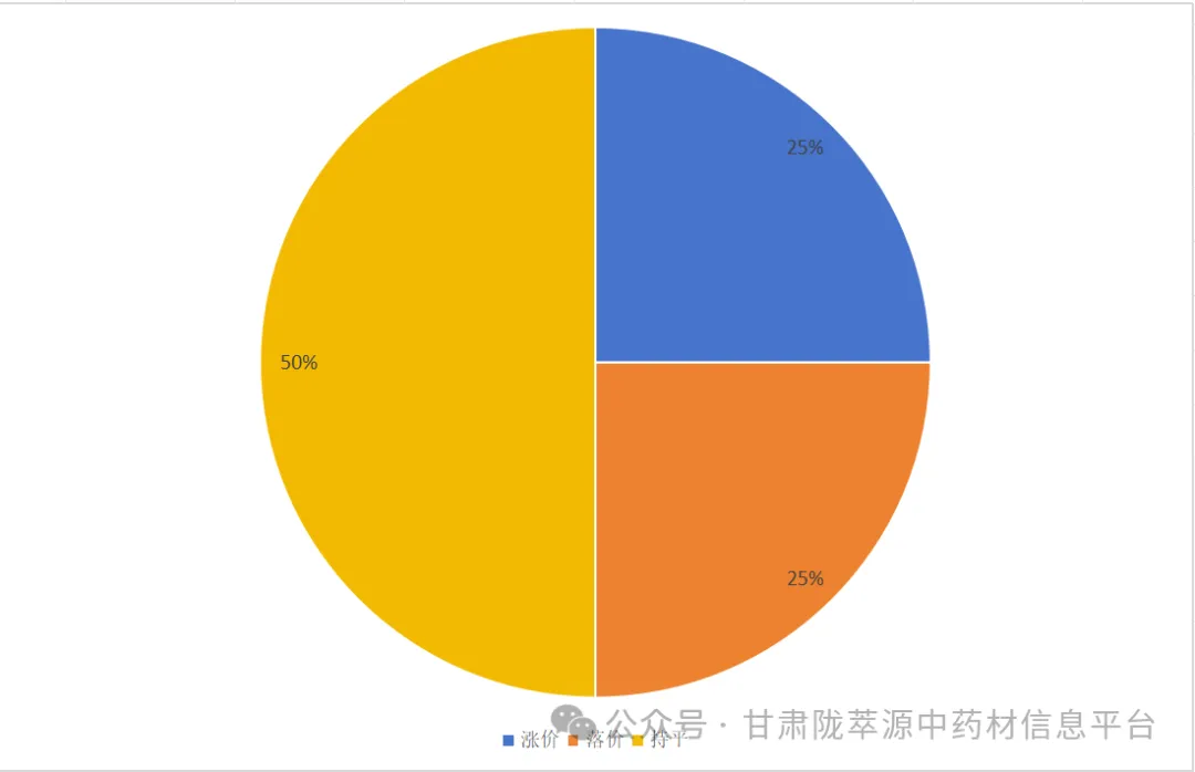 花类4个品规中(款冬花、玫瑰花、红花、金银花),涨价品规占25%;落价品规占25%;价格持平的品规占50%。